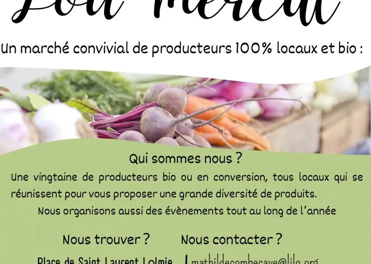 Lou Mercat est un marché de producteurs bio et locaux. Il a lieu tous les mardis de l’année de 17h à 19h pendant la saison estivale, et de 16h30 à 18h30 pendant les mois d’hiver, dans le bourg du village de Saint Laurent Lolmie.