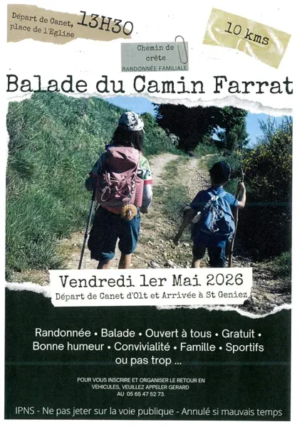 Au départ de la place de l'Eglise de Canet d'Olt à 13h30, cette randonnée familiale de 10 km descend jusqu'à Saint-Geniez d'Olt et d'Aubrac. Que vous soyez sportif (ou pas trop), solo, en famille ou entre amis, chaussez vos chaussures de rando ou vos baskets et venez découvrir (ou redécouvrir) les jolis paysages alentours !