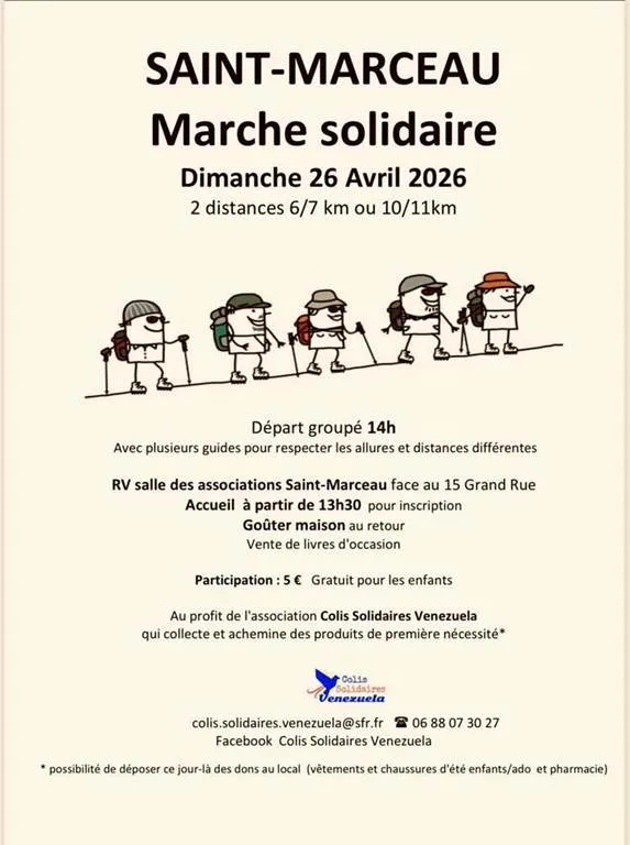 Dimanche 26 avril à 14h Randonnée groupée, départ commun avec possibilité d'opter pour une plus courte distance en cours de chemin.7 km ou 11km Goûter "maison" à l'arrivée. Vente de livres d'occasion au profit de l'association qui expédie des colis au Venezuela. Adulte : 5€ et gratuit pour les enfants