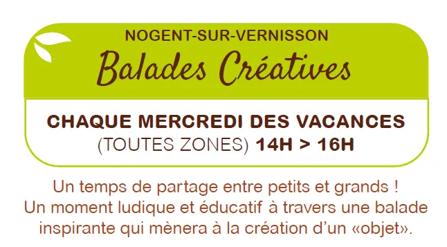 Balades créatives . De 14h à 16h. Ouvert aux adultes et aux enfants à partir de 3 ans (nécessairement accompagnés d'un adulte). Non adhérents 10€/adhérents 8€. Forfait tribu 4 personnes : 3 personnes payantes et 1 personne gratuite.