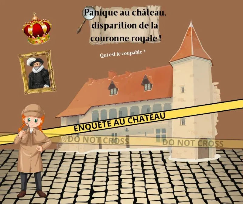Le Château-musée Henri IV s’apprête à accueillir la plus grande exposition de son histoire “Symboles et pouvoir royal”. La pièce maîtresse de cet évènement est la couronne royale d’Henri IV, prêtée par un grand musée national. La veille du vernissage, la vitrine est retrouvée ouverte et vide ! Aucune effraction, le système d’alarme ne s’est pas déclenché... Seul le personnel autorisé avait accès à la salle. Le scandale doit être évité à tout prix ! La police est rapidement dépêchée sur les lieux pour retrouver le coupable et restituer la couronne avant le vernissage qui a lieu dans 1h30...