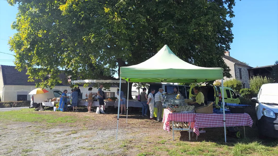Marché de producteurs locaux avec légumes, plants, porc cui noir, pain au levain, savons, produits du Togo, jus, sirops, confitures, canard et poulets, fromages de chèvre et de vache
