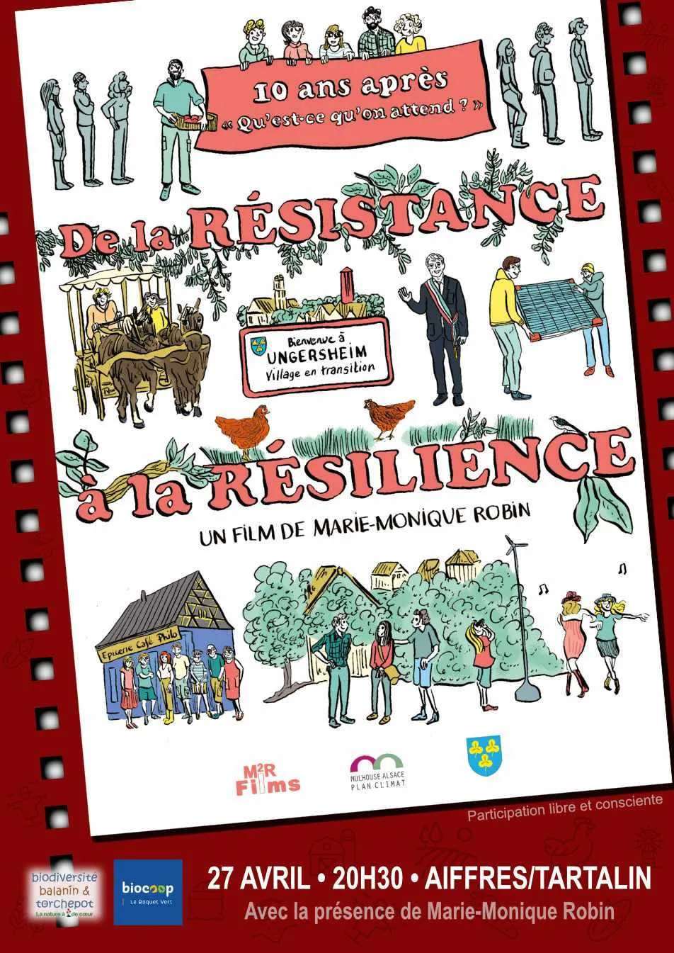 Intitulé « De la résistance à la résilience », le nouveau film de Marie-Monique Robin raconte l’incroyable chemin parcouru depuis le rejet par la municipalité d’un projet d’installation d’un centre « Pierre et Vacances » alors soutenu par tous les élus de la région, jusqu’à la reconnaissance officielle de l’exemplarité de Ungersheim, qui inspire désormais la politique de l’agglomération de Mulhouse, et bien au-delà. Avec un argument de poids : la commune n’a pas augmenté ses impôts depuis... 2003 !
