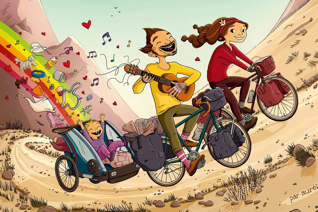 C'est avec leur fille d'un an, une guitare, trois massues de jonglage, et quelques carnets de croquis qu’Aurélia et Anthon se mettent...