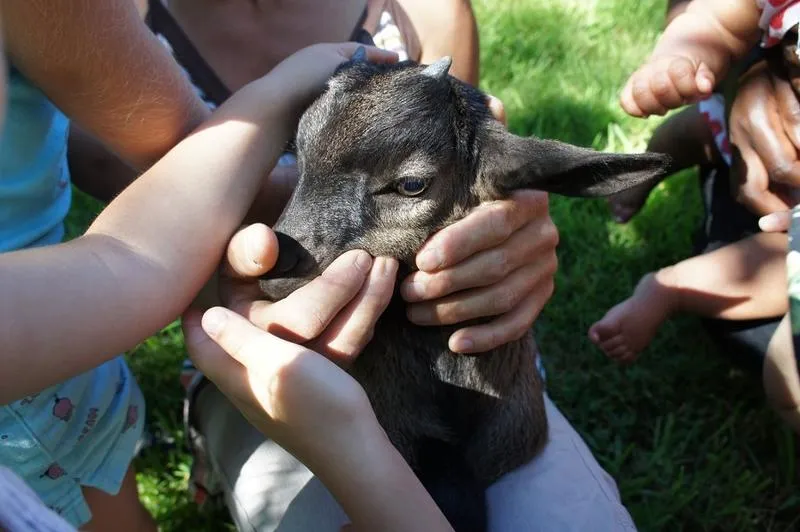 Bien chaussés, nous prenons le sentier qui monte dans le bois en face de La Ferme des Cocottes, en compagnie de mes collègues les plus motivés : Mûre et Gitane les ponettes, Newton, l'âne, Violette et Liseron les chèvres des fossés, Hibou, mon petit pot de colle bien sûr, sous la surveillance d'Ulotte, mon chien de troupeau. Tenus en main et partageant un moment agréable fait de caresses de découvertes et de grignotages, les quadrupèdes motivent les plus jeunes bipèdes à marcher.