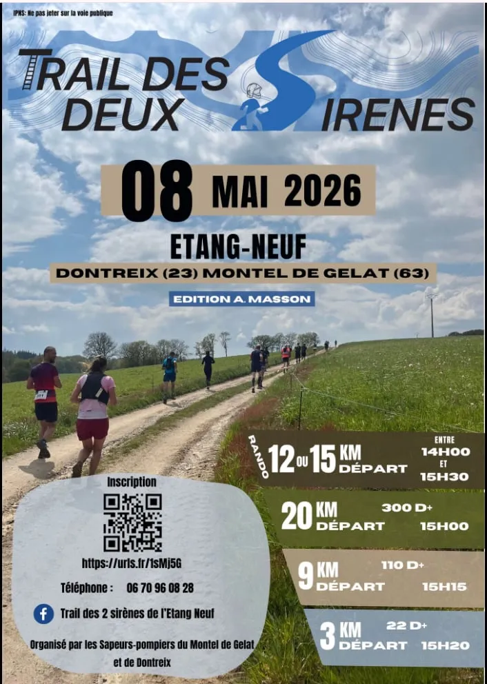 Organisé par les sapeurs-pompiers de Montel de Gelat (63) et Dontreix (23). Cinq boucles : 3 km, 9 km, 12 ou 15 et 20 km.
