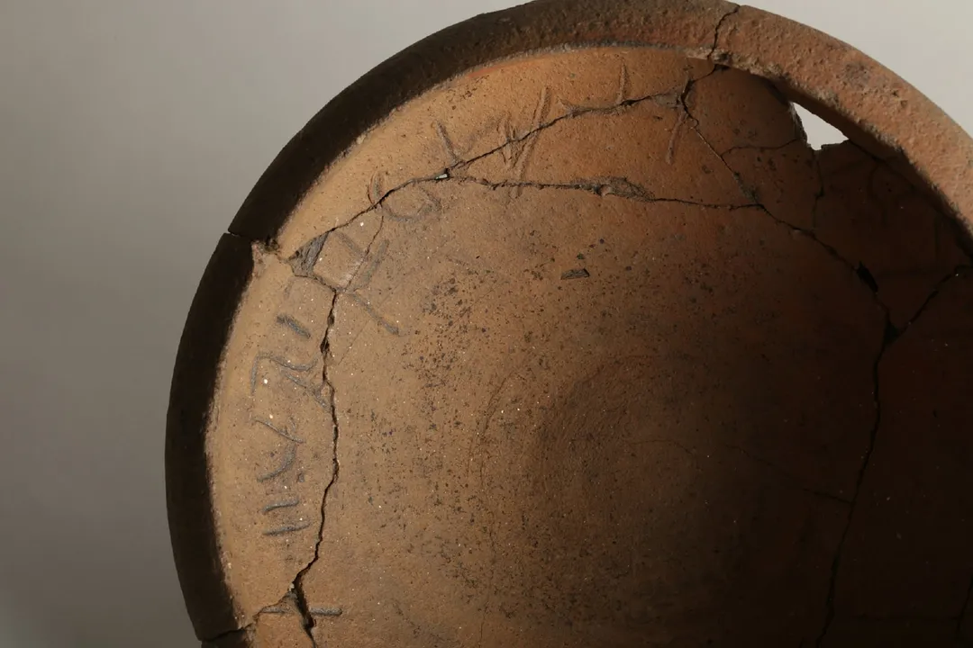 Voici un objet modeste par sa forme : une jatte en céramique commune, recouverte d’un engobe rouge partiellement conservé. Dans l’Antiquité, ce type de récipient servait à préparer les aliments, les cuire et les présenter sur la table. Mais ici, un détail change tout : une longue inscription a été gravée sous la lèvre avant la cuisson du vase…
