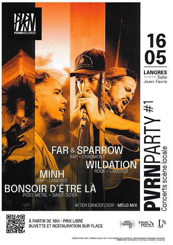 Rendez-vous à la salle Jean Favre à Langres pour la première PVRN Party, une soirée dédiée à la scène haut-marnaise, avec Far & Sparrow (rap), Wildation (rock), Minh (rap) et Bonsoir d’être là...