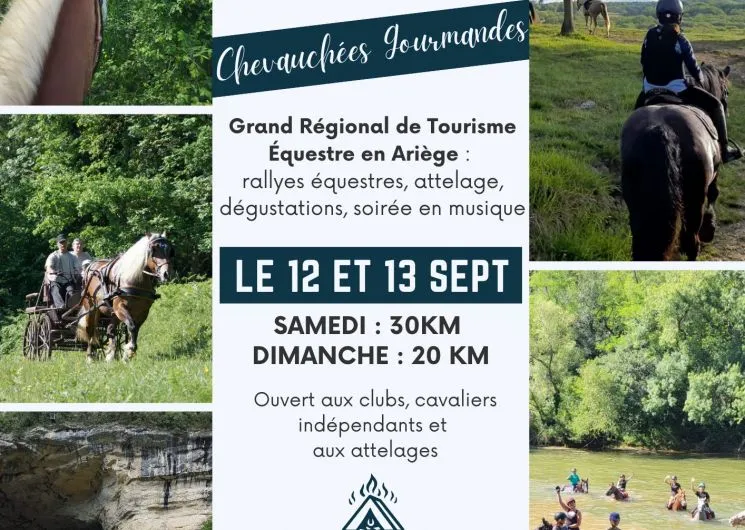 Grand régional de tourisme équestre en Ariège avec rallyes équestres, attelage, dégustations et soirée en musique.