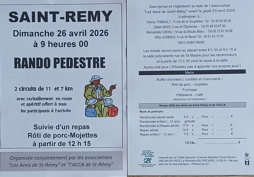 Les Amis de Saint-Rémy organisent, conjointement avec l’ACCA, une randonnée avec 2 circuits de 7 et 11 km, avec ravitaillement.