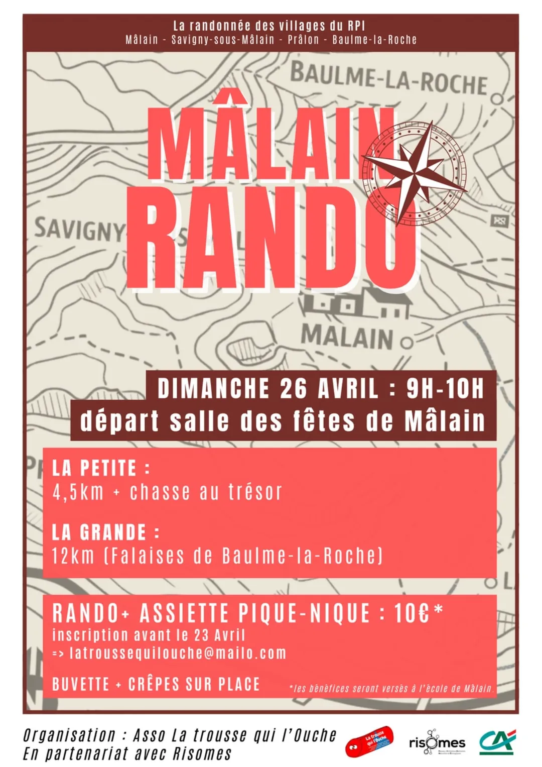 Dimanche 26 avril, l'association de parents d'élèves "La Trousse qui l'Ouche" organise 2 randonnées (petit ou grand circuit) avec possibilité de réserver votre assiette pique-nique, confectionné par les producteurs bio de Mâlain!