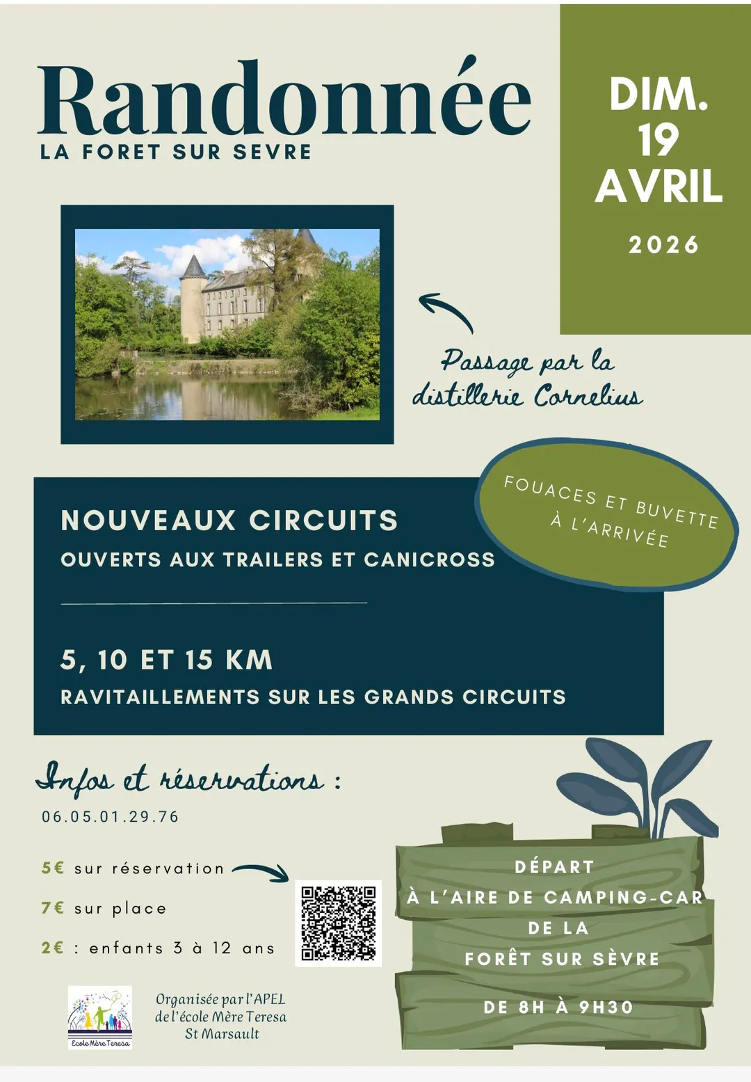 L'APEL de l'école Mère Teresa de Saint Marsault organise une randonnée pédestre ouverte aussi aux trailers et canicross avec 3 circuits de 5, 10 et 15kms.