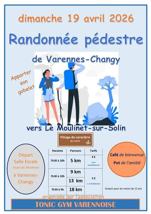 Randonnée pédestre, parcours : 5, 9, 13 et 18 kms. Tarifs selon parcours. Café au départ de la salle Escale, ravitaillement sur le parcours et pot offert à l’arrivée. Organisée par Tonic Gym Varennoise. Ouverte à tous.