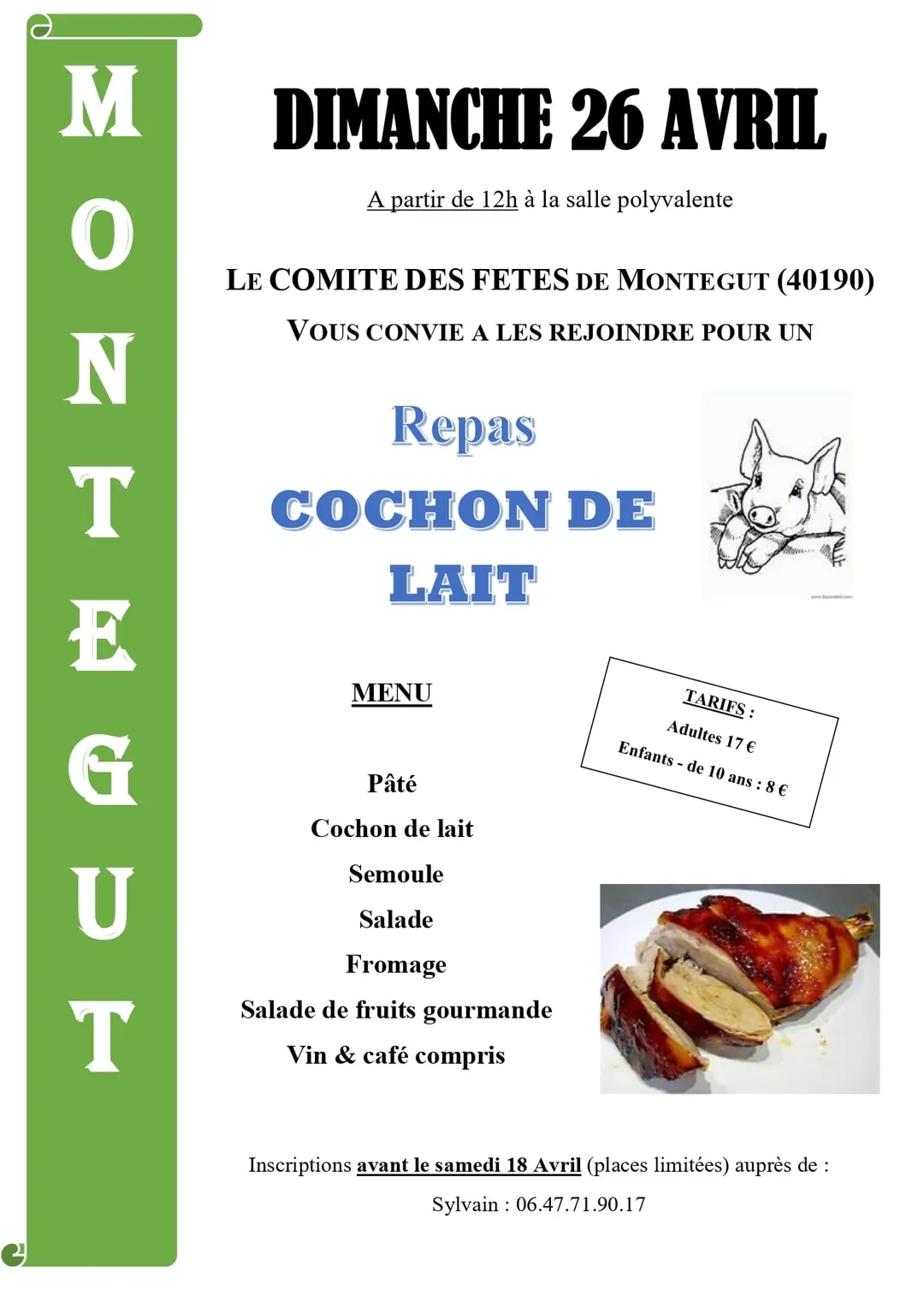 Au menu : Pâté | Cochon de lait | Semoule | Salade | Fromage | Salade de fruits gourmande | Vins & Café compris.
