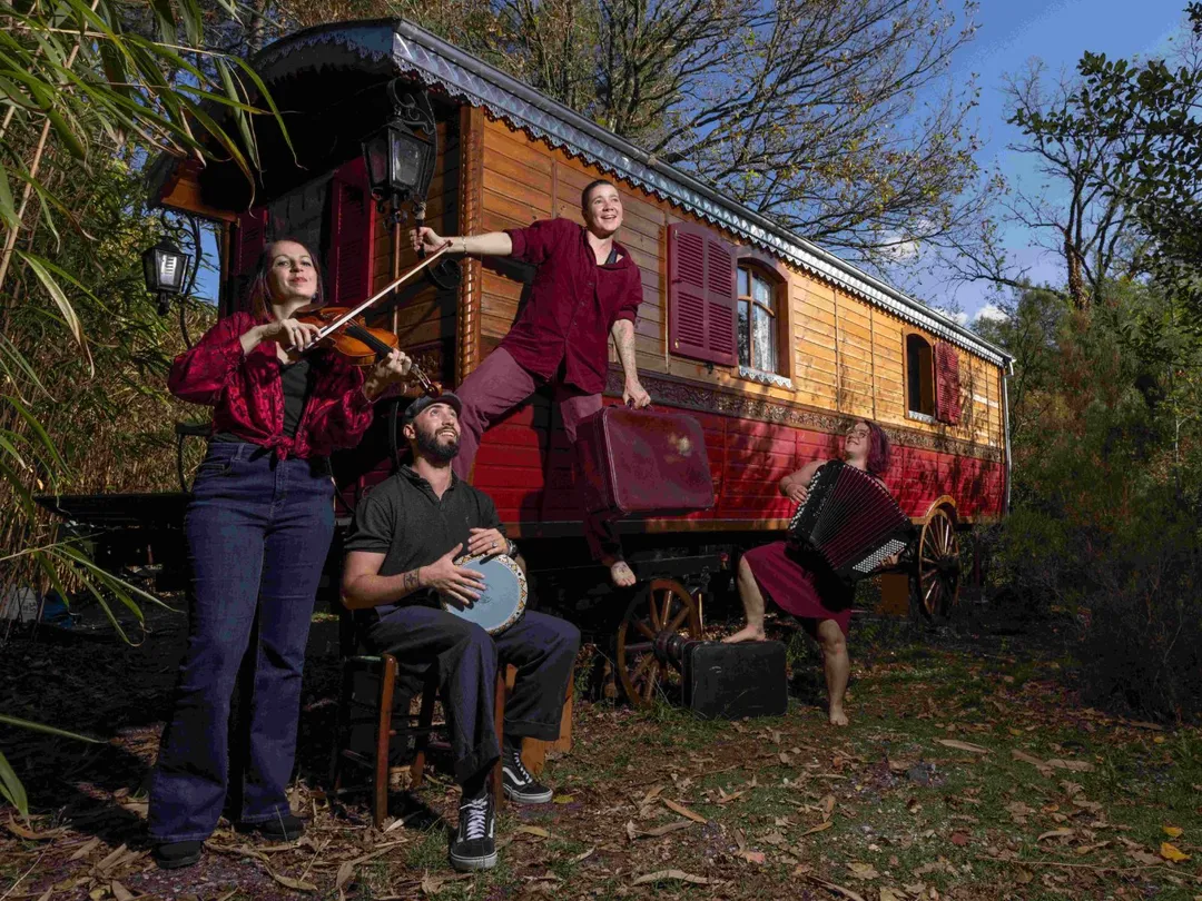 Une roulotte posée sous les étoiles, un feu qui crépite, des voix qui s’élèvent et des rires qui s’envolent dans la nuit. Tout à l’Est vous convie à une grande fête nomade, où une famille d’âmes vagabondes vous invite au voyage. Ici, les cœurs s’accordent et les langues se délient pour chanter et danser l’amour, la joie et le partage. Les instruments s’éveillent : les cordes vibrent, le soufflet s’ouvre, les rythmes s’enfièvrent. L’ivresse naît et les corps se laissent emporter sur les routes entre les Carpates et les Balkans. Un concert comme un arrêt dans le temps, une histoire commune, « une dernière pour la route » avant de repartir.