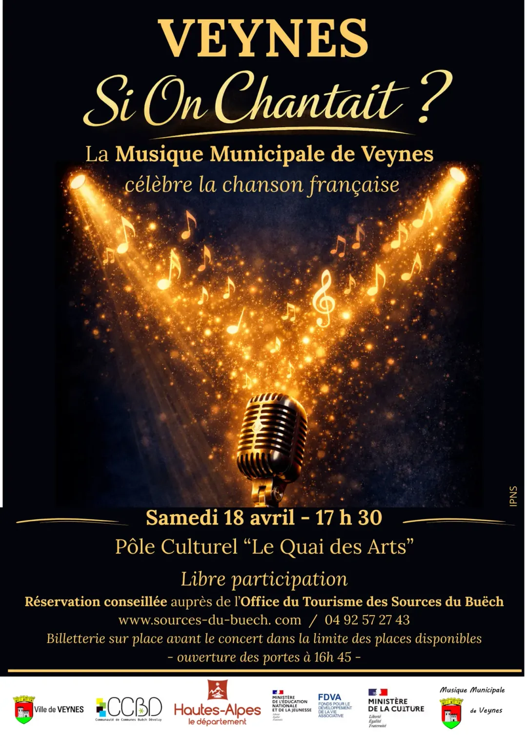 La Musique Municipale de Veynes vous invite à un voyage musical au cœur des plus grandes chansons françaises. Avec ce concert intitulé « Si on chantait ? », les musiciens rendront hommage à ces mélodies et ces refrains qui ont traversé les générations et marqué l’histoire de la chanson. Ils revisiteront de nombreux titres emblématiques interprétés par des artistes incontournables comme Édith Piaf, Charles Aznavour, Michel Fugain, France Gall, Michel Sardou ou encore Jean-Jacques Goldman.
