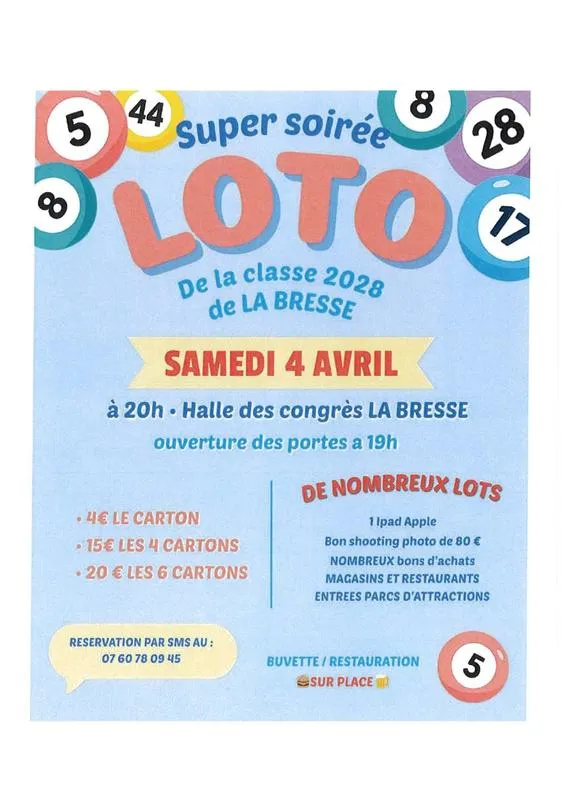 Tarifs des cartons de participation: 4€/le carton, 15€/les 4 cartons, 20€/les 6 cartons. Restauration, buvette sur place et de nombreux lots à gagner: 1 Ipad Apple, bon shooting photo de 80€, nombreux bons d'achats, magasins et restaurants, entrées parcs d'attractions. Réservation par sms au: 07.60.78.09.45.
