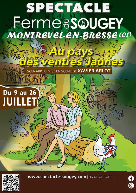 Dans le cadre authentique de la ferme du Sougey, à Montrevel-en-Bresse, le spectacle du Sougey donne rendez-vous au public à l’été 2026 pour découvrir « Au pays des Ventres jaunes », une création originale mise en scène par Xavier Arlot. Ce grand spectacle son et lumière en plein air plonge les spectateurs au cœur de la Bresse des années 1960, dans une histoire savoureuse où se mêlent humour, émotion, traditions rurales, esprit de village et personnages hauts en couleur.
