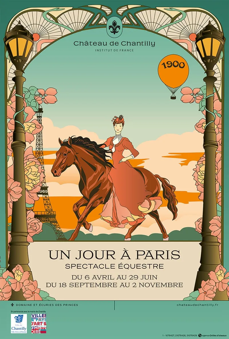 Les 7 cavalières de la Compagnie équestre du Château de Chantilly accompagnées d’un mime, d’un acrobate aérien, d’un voltigeur et des chevaux, ânes et poneys des Grandes écuries vous transporteront dans cette ambiance trépidante de Paris en 1900.