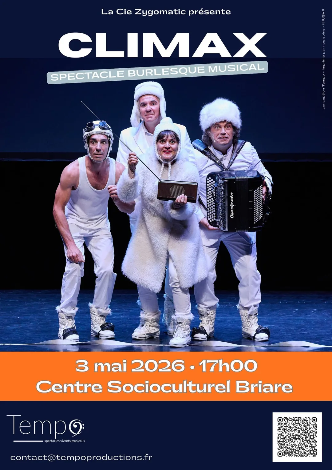 Le 3 mai à Briare, découvrez Climax, un spectacle musical de la compagnie Zygomatic à l’Auditorium Jean Poulain. Théâtre, danse, chant et humour s’entremêlent pour offrir une création engagée et originale, qui questionne notre monde avec énergie, intelligence et sens du décalage. Proposé par Tempo.
