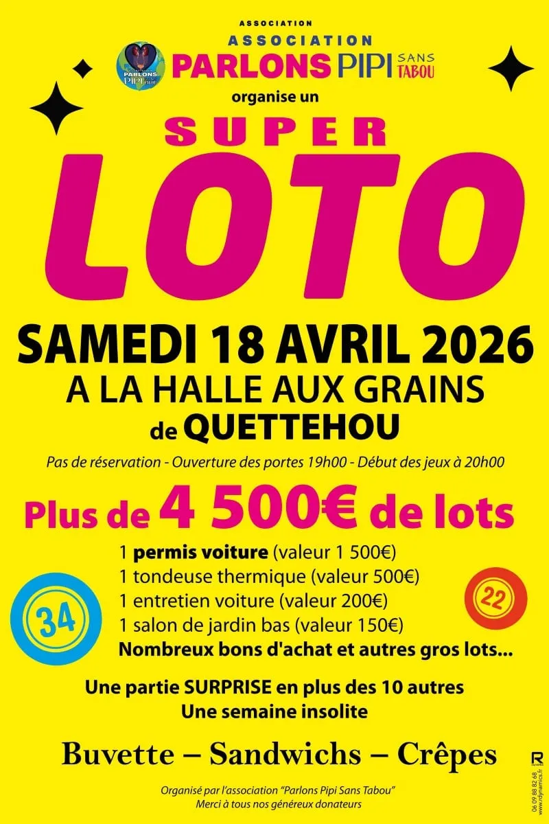 L'association "Parlons pipi sans tabou" de Quettehou vous propose une soirée loto avec de nombreux lots à gagner. Sans réservation à 20h00 à la Halle aux grains (ouverture des portes à 19h00).