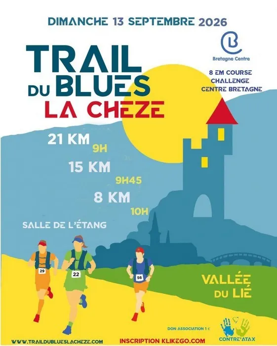 Après 2 ans d’interruption, le Trail du Blues-La Chèze revient.3 distances 21 km, départ à 9h, 15km, départ à 9h 45 et 8km, départ à 10h.Il s’agit de 3 boucles au départ de l’étang de La Chèze, dans un paysage varié dans la vallée du Lié : chemins, bois, vestiges du château …La course fait partie du challenge centre Bretagne. 1€/ coureur sera reversé à l’association Contr’atax. Inscription sur Klikego