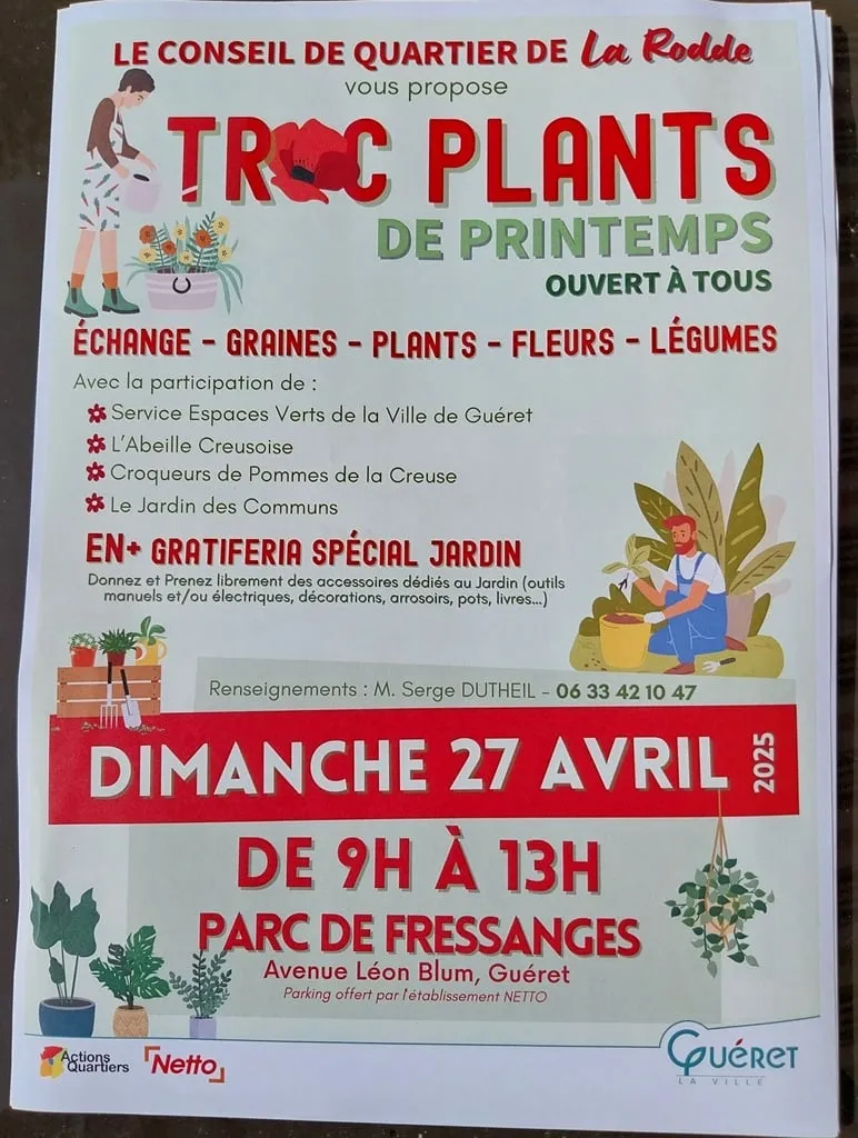Au programme : échange, graines, plants, fleurs, légumes... avec la participation du service Espaces Verts de la ville de Guéret, l'Abeille Creusoise, les Croqueurs de pomme de la Creuse et le Jardin des communs