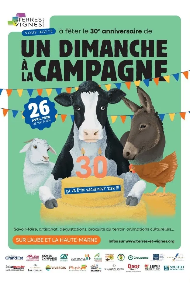 Terres & Vignes, accompagné de ses nombreux partenaires, poursuit ses efforts pour proposer aux visiteurs une journée riche en découvertes sur l’agriculture auboise, la ruralité et la culture au cœur de nos campagnes, pour ainsi révéler aux visiteurs la force et la diversité de l’agriculture du territoire. Cette année nous célébrons la 30ème édition d'un Dimanche à la Campagne !