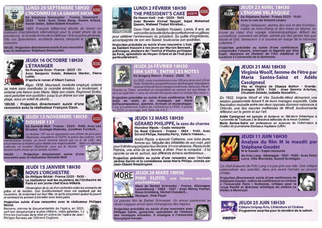 Unipop est un programme annuel de thématiques d'Histoire ou d'Art, Littérature et Cinéma transmis en direct dans notre cinéma et accompagnés par la projection d'un film.