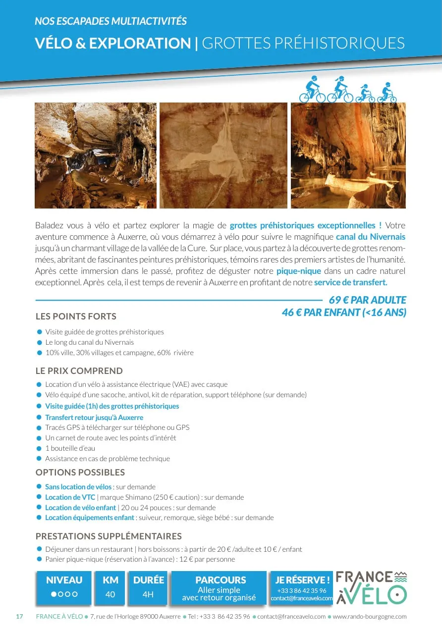 Baladez vous à vélo et partez explorer la magie de grottes préhistoriques exceptionnelles ! Votre aventure commence à Auxerre, où vous démarrez à vélo pour suivre le magnifique canal du Nivernais jusqu’à un charmant village de la vallée de la Cure. Sur place, vous partez à la découverte de grottes renommées, abritant de fascinantes peintures préhistoriques, témoins rares des premiers artistes de l’humanité. Après cette immersion dans le passé, profitez de déguster notre pique-nique dans un cadre naturel exceptionnel. Après cela, il est temps de revenir à Auxerre en profitant de notre service de transfert.