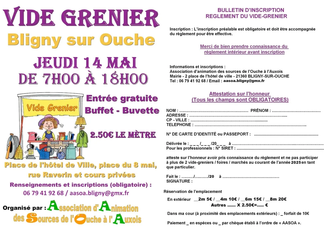 L'Association d'Animation des Sources de l’Ouche à l’Auxois organise son traditionnel vide-greniers, le jeudi 14 Mai 2026 de 7h à 18h, sur la place de l'hôtel de ville , dans les rues adjacentes et dans les cours privées.