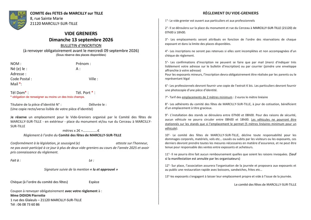 Le comité des fêtes de Marcilly-sur-Tille organise son vide greniers le 13 septembre 2026. Retrouvez les exposants de 7h à 18h. Entrée gratuite, buvette et restauration.