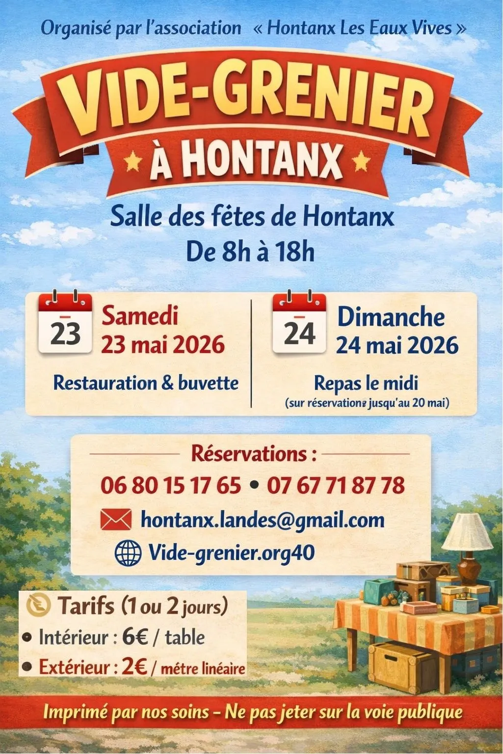 Marre de voir vos malles et votre grenier remplis d'affaires que vous n'utilisez plus, qui encombre de l'espace que vous souhaiteriez exploiter ? C'est le moment de faire des heureux en les mettant à la vente lors d'un vide-grenier à Hontanx !