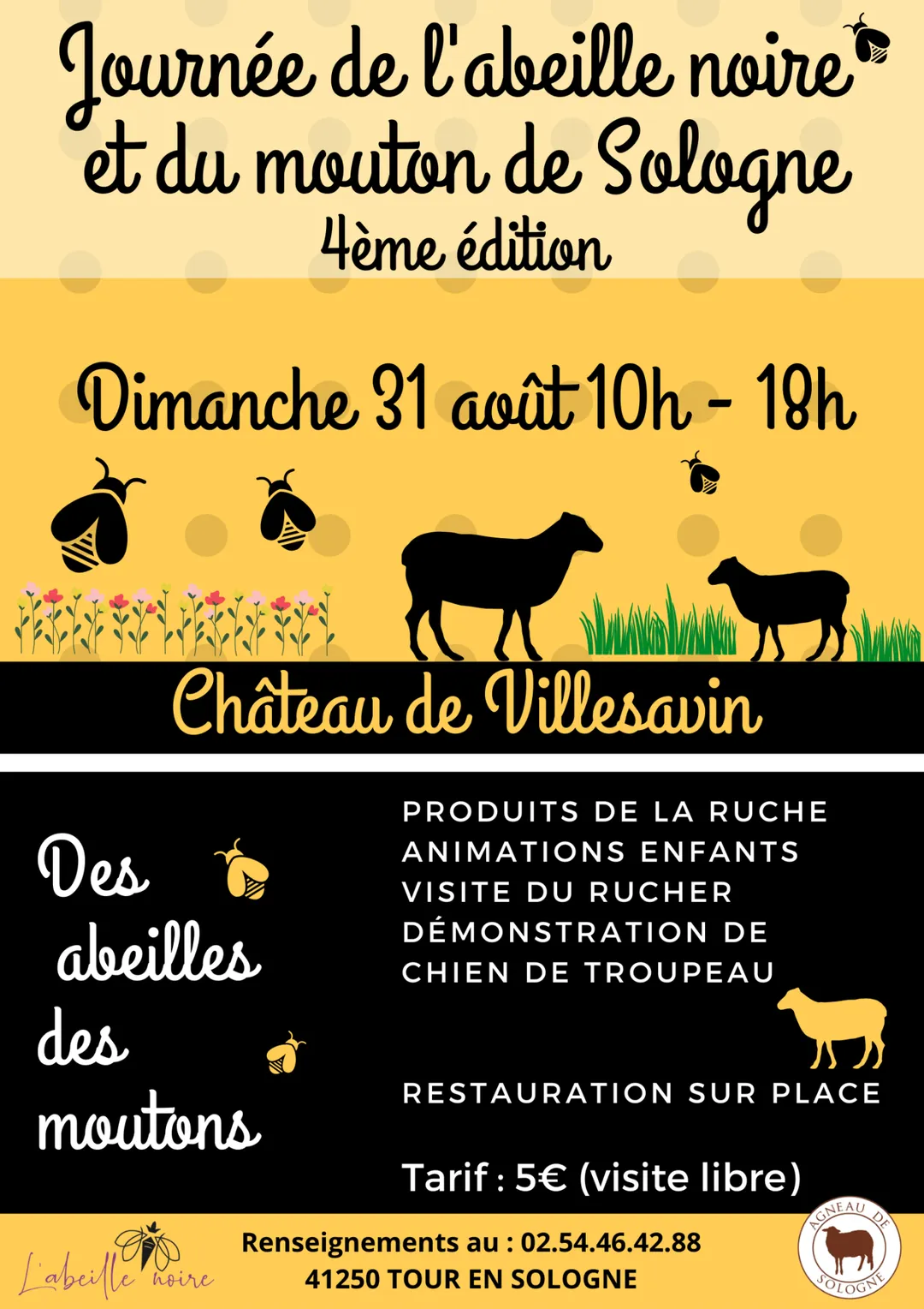 Journée de l'abeille noire et du mouton de Sologne au Château de Villesavin. Organisée par l'association agneau de Sologne et le château de Villesavin Vous découvrirez le travail de la laine, la tonte des brebis , une exposition , des chiens de troupeau mais aussi une ruche vitrée, un parcours pédagogique des animations pour enfants, l'extraction de miel.... une grande variété de plante et de déco de jardin complète le weekend. Une journée familiale et pédagogique.
