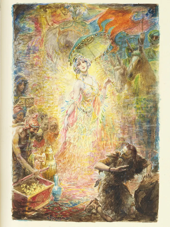 Georges-Antoine Rochegrosse (1859-1938), artiste précoce, a eu la chance de rencontrer Gustave Flaubert à son domicile de Croisset et d'y dessiner le cabinet de travail de l'écrivain. Devenu peintre d'histoire et illustrateur, Rochegrosse illustre _Salammbô_ en 1900, puis _La Tentation de saint Antoine._ De nombreux dessins aquarellés ainsi que des éditions illustrées montrent avec brio comment l'artiste s'est emparé des oeuvres de Gustave Flaubert.