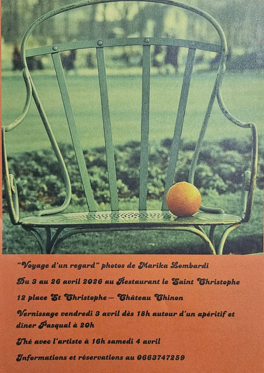 “Voyage d’un regard” photos de Marika lombardi du 3 au 26 avril au restaurant le Saint Christophe, 12 place St Christophe à Château-Chinon. Vernissage vendredi 3 avril dès 18h autour d’un apéritif...